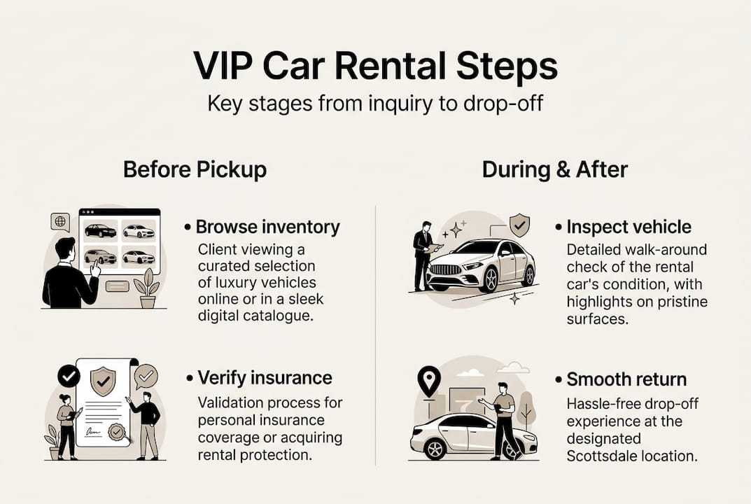 You've planned the perfect Scottsdale getaway, the hotel is booked, the dinner reservations are locked in, and then you hit the rental process. Suddenly there are insurance questions, deposit holds, mileage caps, and a contract that reads like a legal brief. For travelers who expect every detail to be handled with precision, this friction is genuinely frustrating. The good news is that a clear, proven workflow eliminates nearly all of it. This guide walks you through every stage of a luxury car rental in Scottsdale, from the first inquiry to the final drop-off, so you arrive focused on the experience, not the paperwork.